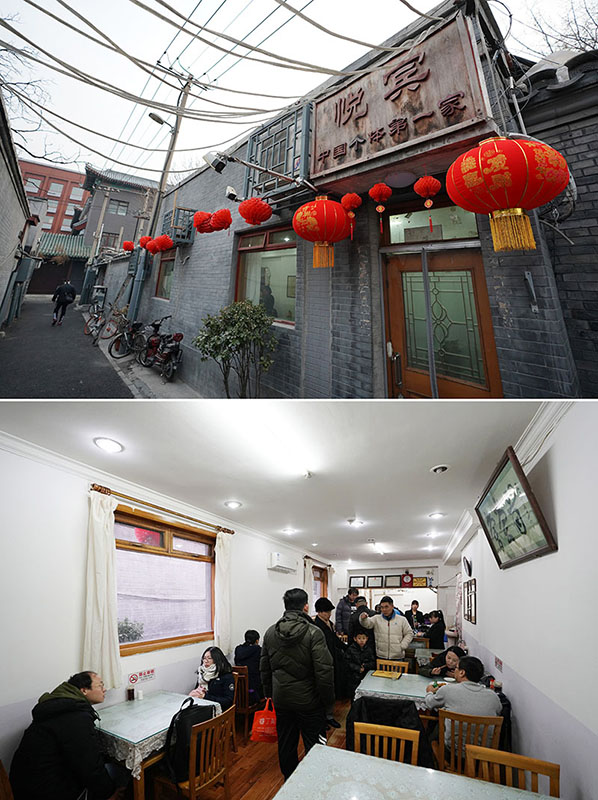 拼版照片:上圖為改革開(kāi)放后中國(guó)的第一家個(gè)體飯館——中國(guó)美術(shù)館正門對(duì)面翠花胡同里的悅賓飯店;下圖為顧客在悅賓飯店里就餐(2019年1月29日攝)。新華社記者 鞠煥宗 攝